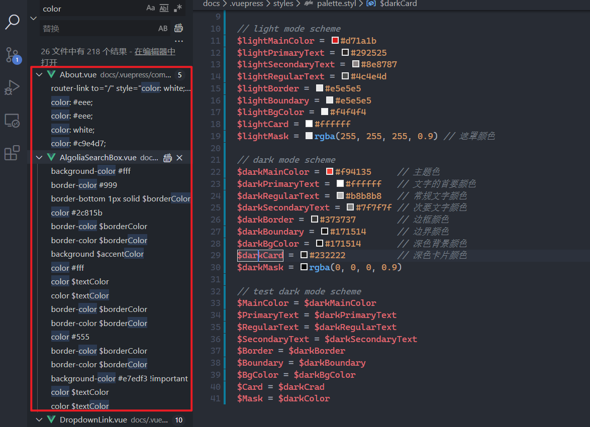 - 两种模式需要「单独替换」,当亮色模式测试没有问题之后,再对暗色模式进行测试,当两个模式都单独测试完美之后,再进行主题切换工作。避免一次修改太多,出现问题不知道哪里出的问题。