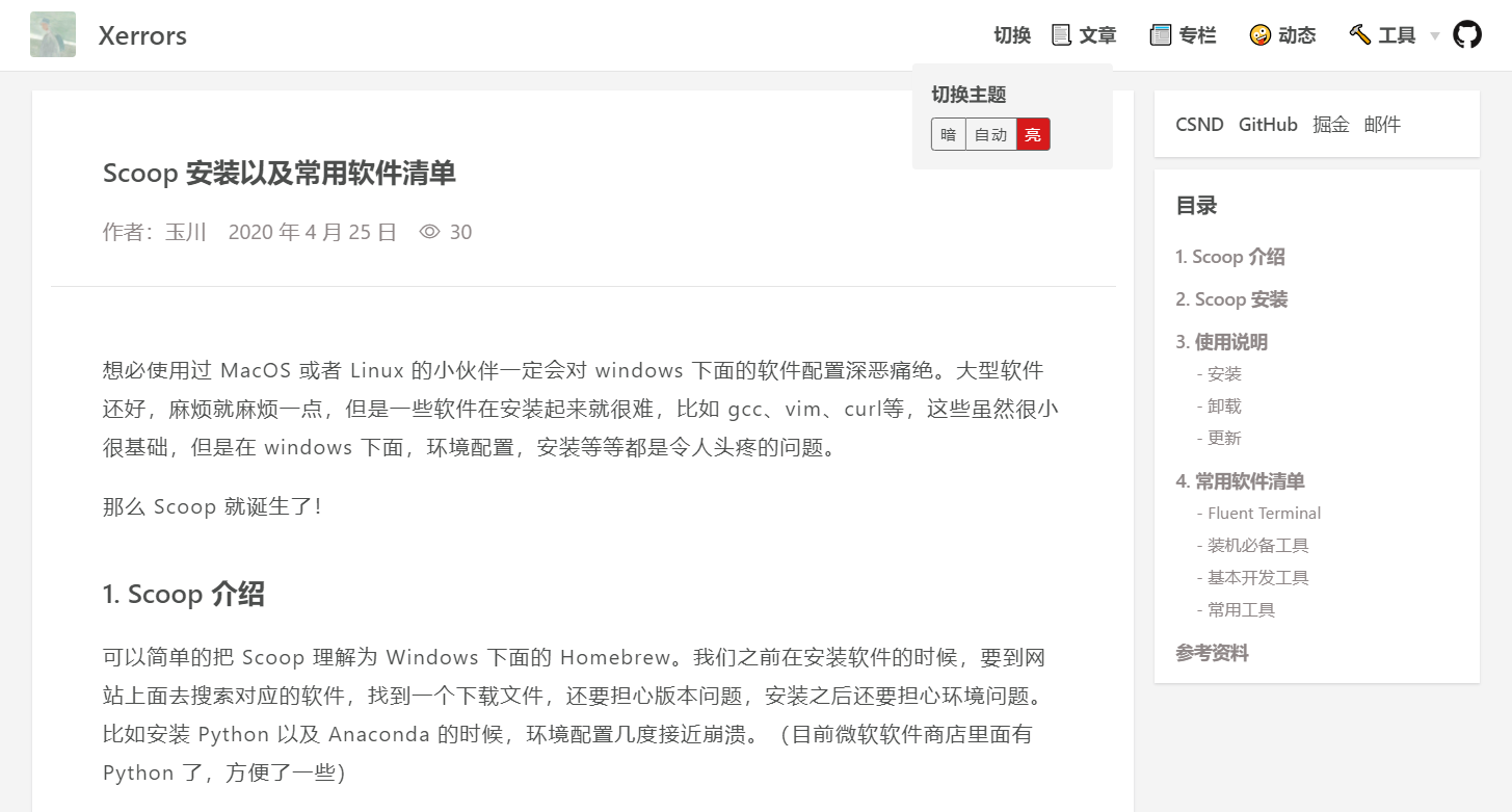 当然如果是单纯想要做一个好看的博客网站,同时还想要支持暗色模式的话,建议直接使用「 vuepress-theme-reco 」这个主题,配置起来方便省心,文档写的也很好。要是想要属于自己的主题、想要折腾锻炼自己的话,那么这篇文章绝对就是适合你的。