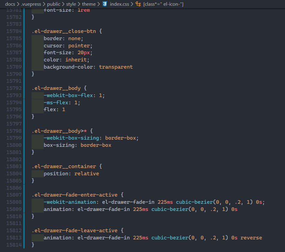 加上这句话之后,在动态切换主题的同时会修改 body 元素的类,如果是暗色模式,body 的类就会变成 dark-mode,如果是亮色模式,body 的类就会变成 light-mode,那么如果我们在 ElementUI 的 css 文件里面,加上命名空间 .dark-mode,这不就能够实现动态切换主题了吗~;也就是说,原本的 dark.css 和 light.css 是这么定义的: