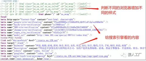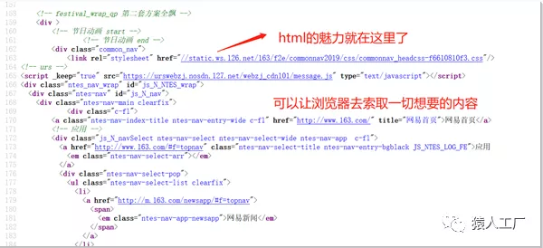 我们仅仅发起了一个www.163.com的请求,为什么浏览器却发起了多达290个请求呢?我们看看html文件的内容:
