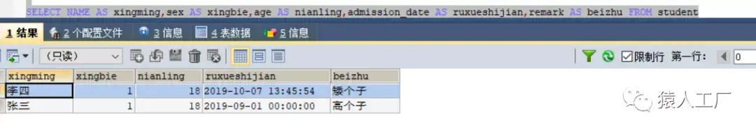 注意:当limit条件后跟随1个数字时,表示最多返回满足条件的多少条数据。