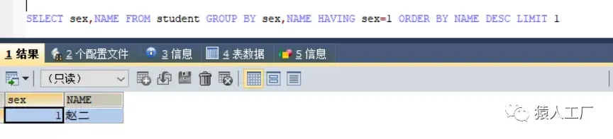查询性别和姓名,按性别和姓名分组后,并且要求sex=1(男性)的数据,按姓名降序排列,只返回第一条数据