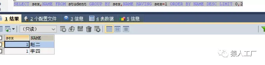 查询性别和姓名,按性别和姓名分组后,并且要求sex=1(男性)的数据,按姓名降序排列,从第一条数据开始,返回两条数据
