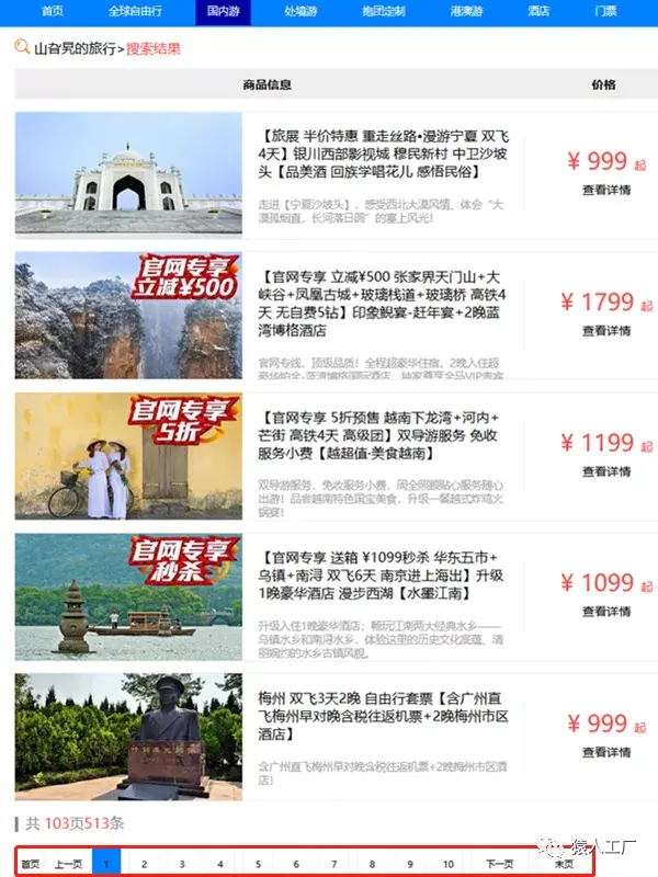 红色框画起来的范围就是我们需要考虑的分页内容了。考虑到是分类列表页面,页面跳转时,浏览器会发起get请求,将类目的id传过来,所以我们通过分类id来确定列表页面需要展示哪个分类下线路信息的数据,后端程序完成线路数据的查询,返回给列表页。由于线路的数据包含:线路基本信息、线路图片信息、线路商家信息、线路收藏信息、所以一次操作可能涉及多个表的数据。因为某个类型的线路信息可能很多,一次也没必要展示完全,所以列表页下方,有分页标记,我们浏览数据需要像“翻书”一样查看。也就是说,我们需要设定分页的大小,每一次,获取每一页的数据就好了。