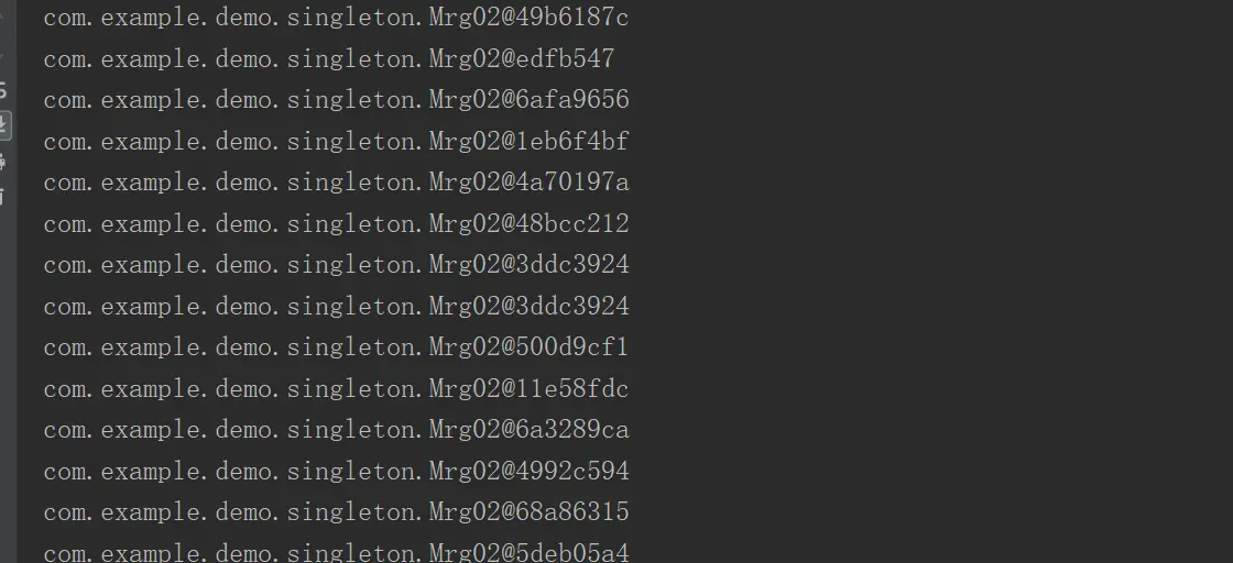 public class Mrg02 { private static Mrg02 MRG_02 ; private Mrg02(){} public static Mrg02 getMrg02(){ if (MRG_02==null){ MRG_02 = new Mrg02(); } return MRG_02; } }懒汉式就是将实例化对象的时机改成在使用的时候实例化,如果不使用就不实例化,这样就不会造成资源的浪费了。但是这种写法有很大的问题,比如在这个时候使用多线程获取单例对象的时候,就可能会造成对象不是单例,如下图打印出来的对象的地址并不是同一个对象