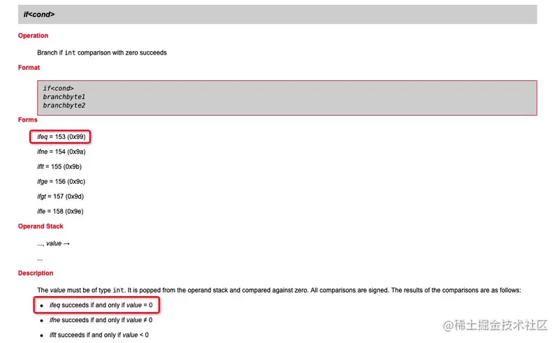 从上图也可以看出,ifeq 助记符的作用是:当栈顶 int 型数值等于0时跳转。这里跳转的意思就是不执行语句块中的代码。