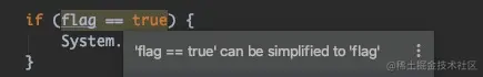 关于上述的示例代码,编译器或许会在第二个 if 语句提醒你可以 Simplify,当你执行简化以后你会发现它将 if (flag == true) 变成了 if (flag),如下图所示。
