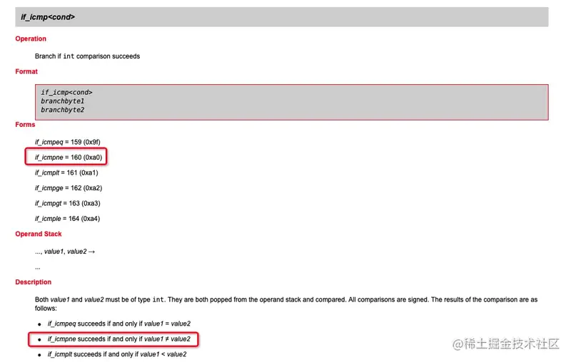 从上图可以看到,if_icmpne 助记符的作用是:比较栈顶两int型数值大小,当结果不相等时跳转。