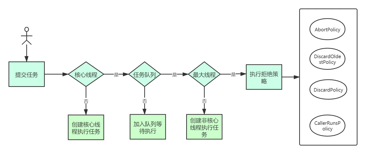 - 如果加入队列失败,则创建非核心线程执行任务(不得超过最大线程数量)