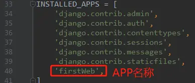 APP的目录,打开项目所在的命令行,输入:python manage.py startapp firstWeb,要确保manage.py在当前目录下。还要把新建的APP添加到上文中的setting中。至此,完成了。