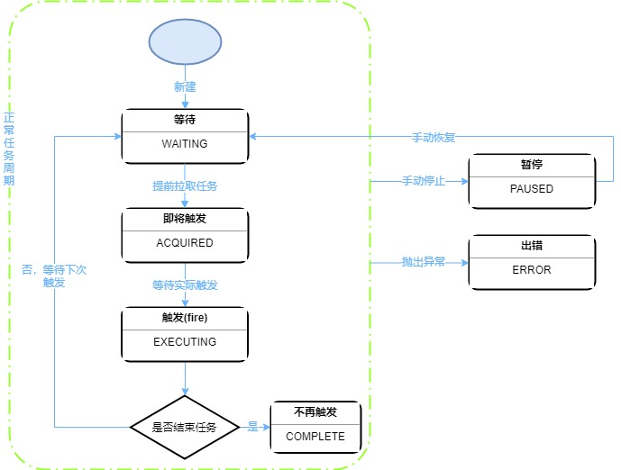 trigger的初始状态是WAITING,处于WAITING状态的trigger等待被触发。调度线程会不停地扫triggers表,根据NEXT_FIRE_TIME提前拉取即将触发的trigger,如果这个trigger被该调度线程拉取到,它的状态就会变为ACQUIRED。因为是提前拉取trigger,并未到达trigger真正的触发时刻,所以调度线程会等到真正触发的时刻,再将trigger状态由ACQUIRED改为EXECUTING。如果这个trigger不再执行,就将状态改为COMPLETE,否则为WAITING,开始新的周期。如果这个周期中的任何环节抛出异常,trigger的状态会变成ERROR。如果手动暂停这个trigger,状态会变成PAUSED。