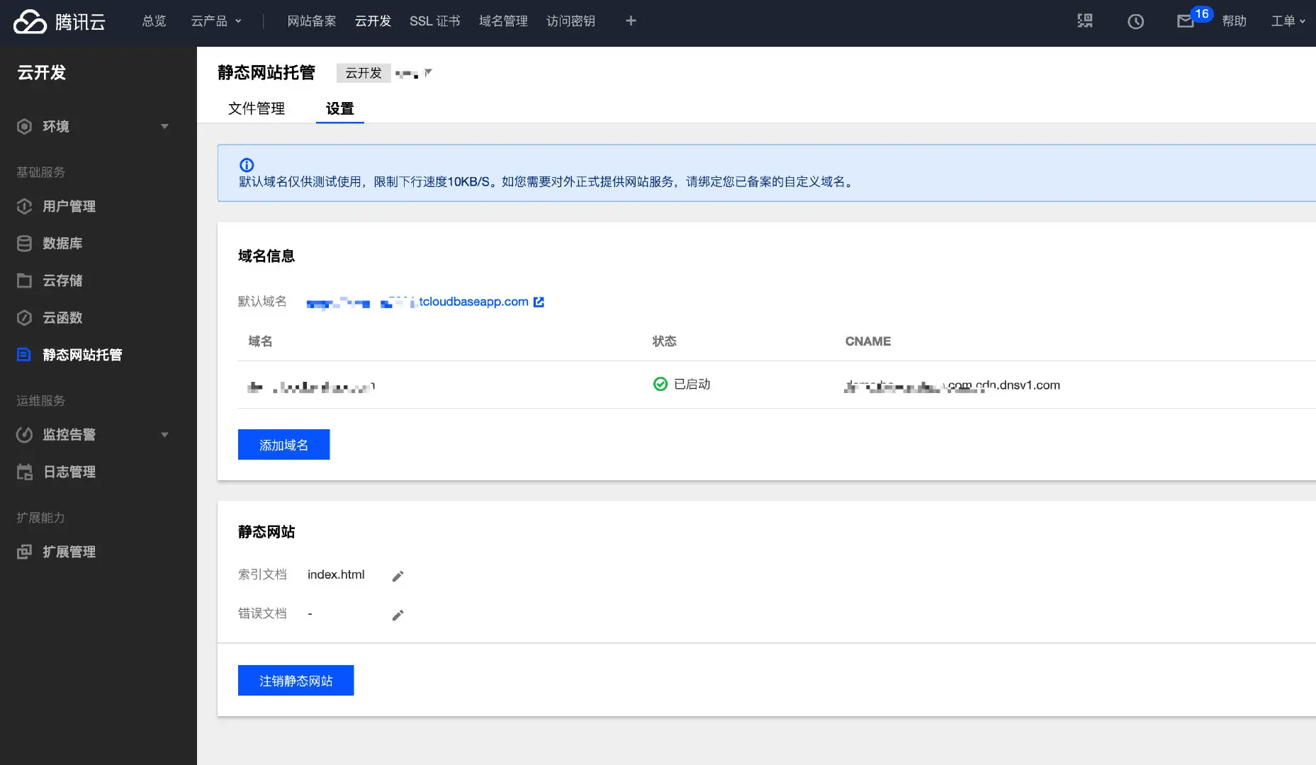 云开发提供的免费的二级域名下行速度有所限制,开发者最好绑定一个自己的域名,绑定域名是免费的,还可以在腾讯云配置一个免费的 SSL 证书,来通过 HTTPS 访问自己的网站。