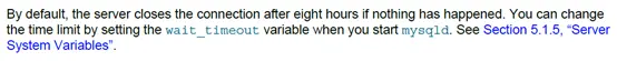 可是,在MySQL文档里写的很清楚,连接只有在8小时什么也不干的情况才会被关闭。而我们的情况是,挂掉的前一秒还在干活。