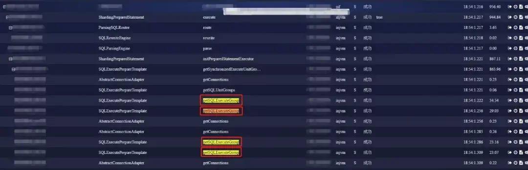 一条逻辑SQL期望路由到一个物理表,对应一次getSQLExecuteGroup调用。在SGM中过滤出慢SQL,查看其完整调用链,发现getSQLExecuteGroup被调用了n次,基本可以确定是全路由的情况。下图就是真实翻车现场: