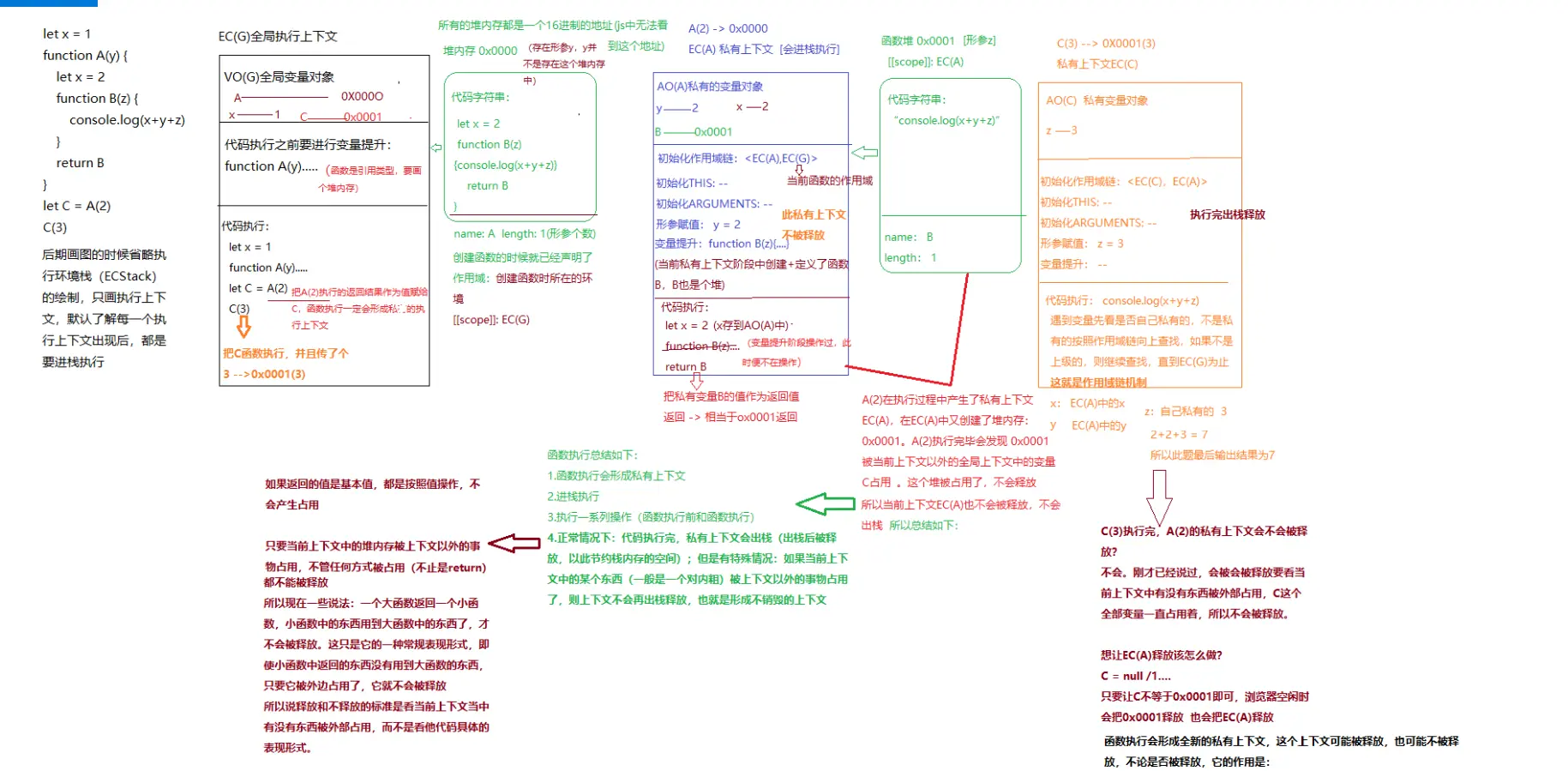 let x = 1; // 创建值1,创建变量x,存到VO(G)中,x和1关联 function A(y) { // 整个函数已经在变量提升阶段操作过,此时便不在操作 let x = 2; function B(z){ console.log(x + y + z) } return B; } let C = A(2) // 把函数执行的返回结果当作值赋给C C(3) - A(2)执行 =》 0x0000(2)执行