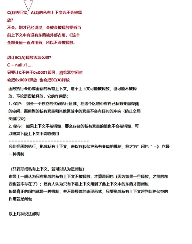 - 其实函数一执行就形成私有上下文,能够保存和保护私有变量,但是市面上一般认为只有形成的私有上下文不被释放才算是闭包(因为如果一旦释放,之前的东西也就不存在了);还有人认为,只有下级上下文中到了此上下文中的东西 才算闭包