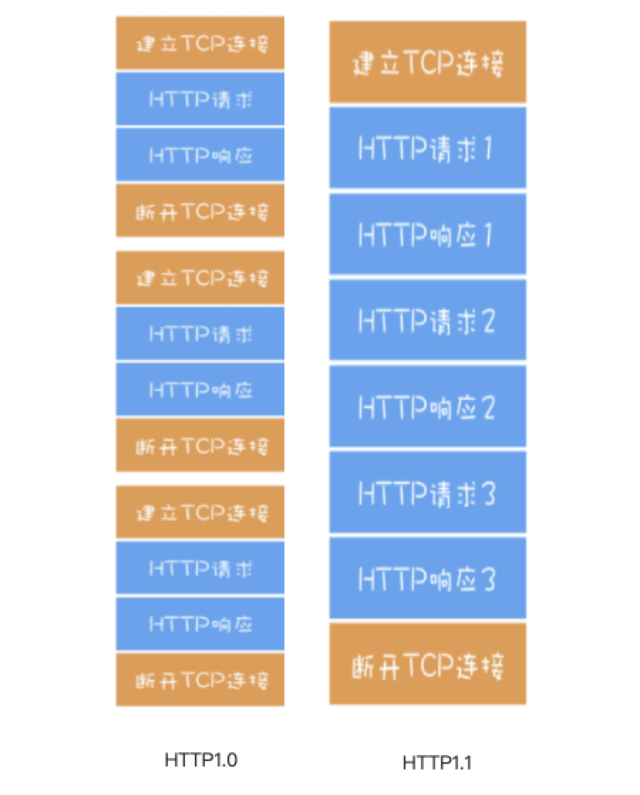 由于请求资源的增多,HTTP1.0的短连接方式无法满足需求,HTTP1.1增加了connection:keep-alive(默认激活,关闭改为close),同一个域名可以建立6个TCP连接(这也是为啥需要配置多个DNS域名的原因增加TCP连接量)