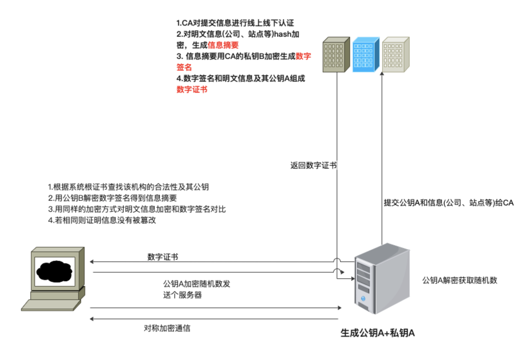 - 服务器生成公钥A+私钥A,将公钥A和信息(公司、网站等)发送给CA机构认证