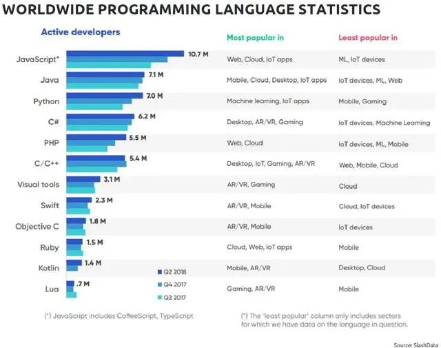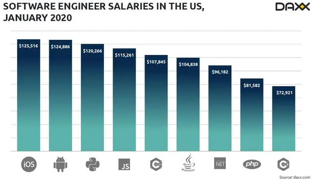 以薪资为基础,截至2020年1月,iOS和Android开发人员可能会获得最高的平均薪水,而应用程序制造商可能会获得最高的评价。其他得到充分补偿的技能包括Python,JavaScript,C ++,Java,.NET,PHP和C#方面的专家。