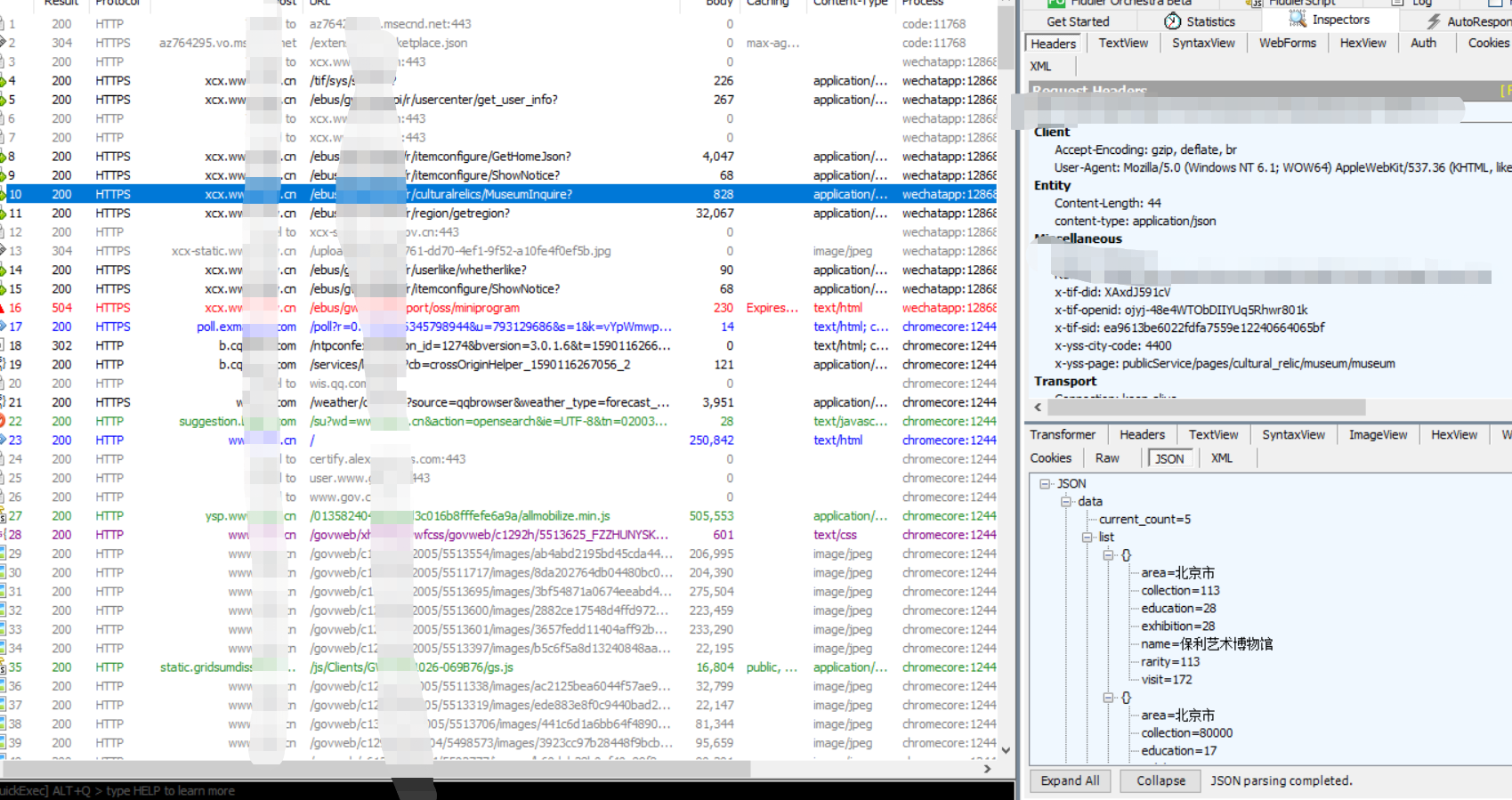配置好之后打开fiddler,然后在电脑微信端打开小程序,就可以看到所有的http请求,host + url 就是要请求的数据接口地址,我是一个一个的点击去找的,通过对比右下角的数据就能知道哪个接口是我们所需要的,下图右侧的text view里面就是请求接口的参数,然后header里面一般会携带一些鉴权的信息,我们一次性获取数据,直接照搬就行了,下图是我测试抓取的数据包