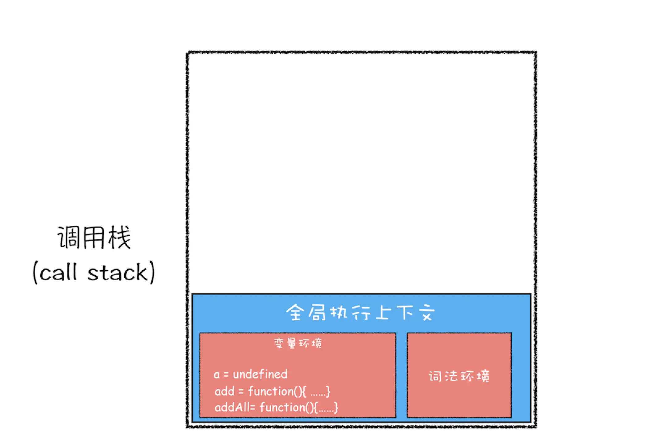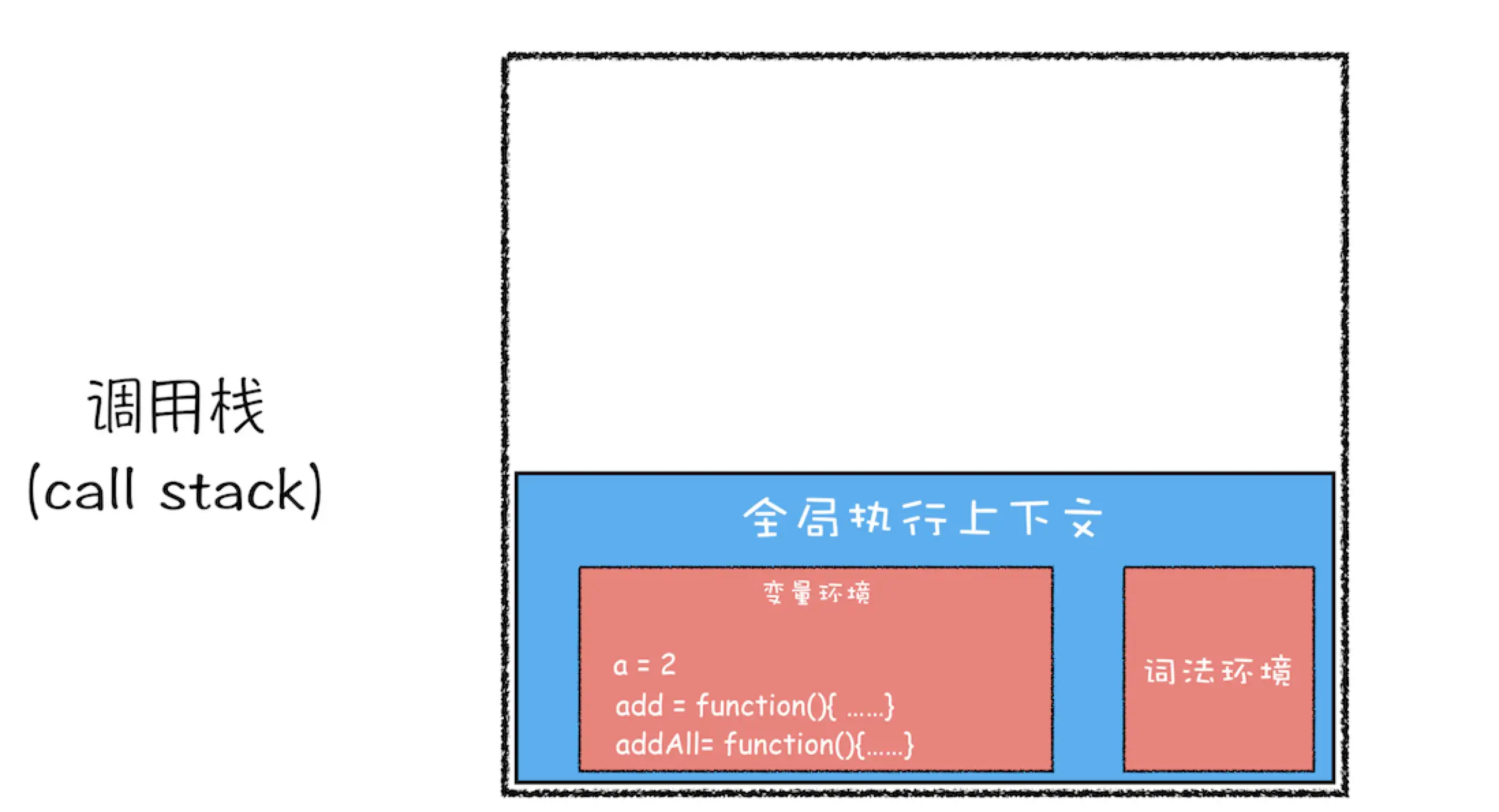 - 紧接着 addAll 执行最后一个相加操作后并返回,addAll 的执行上下文也会从栈顶部弹出,此时调用栈中就只剩下全局上下文了。最终如下图所示: