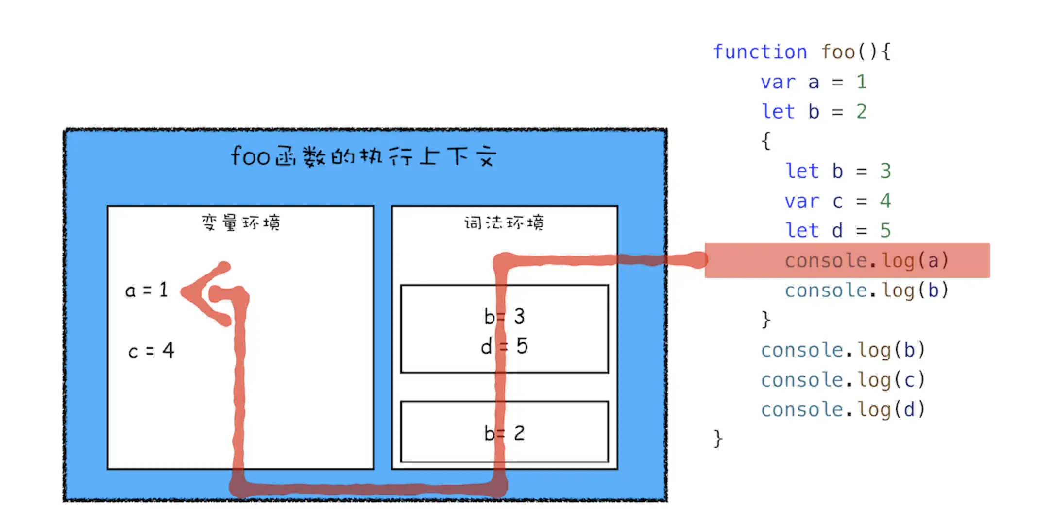 函数内部通过 var 声明的变量,在编译阶段全都被存放到变量环境里面了。通过 let 声明的变量,在编译阶段会被存放到词法环境(Lexical Environment)中。