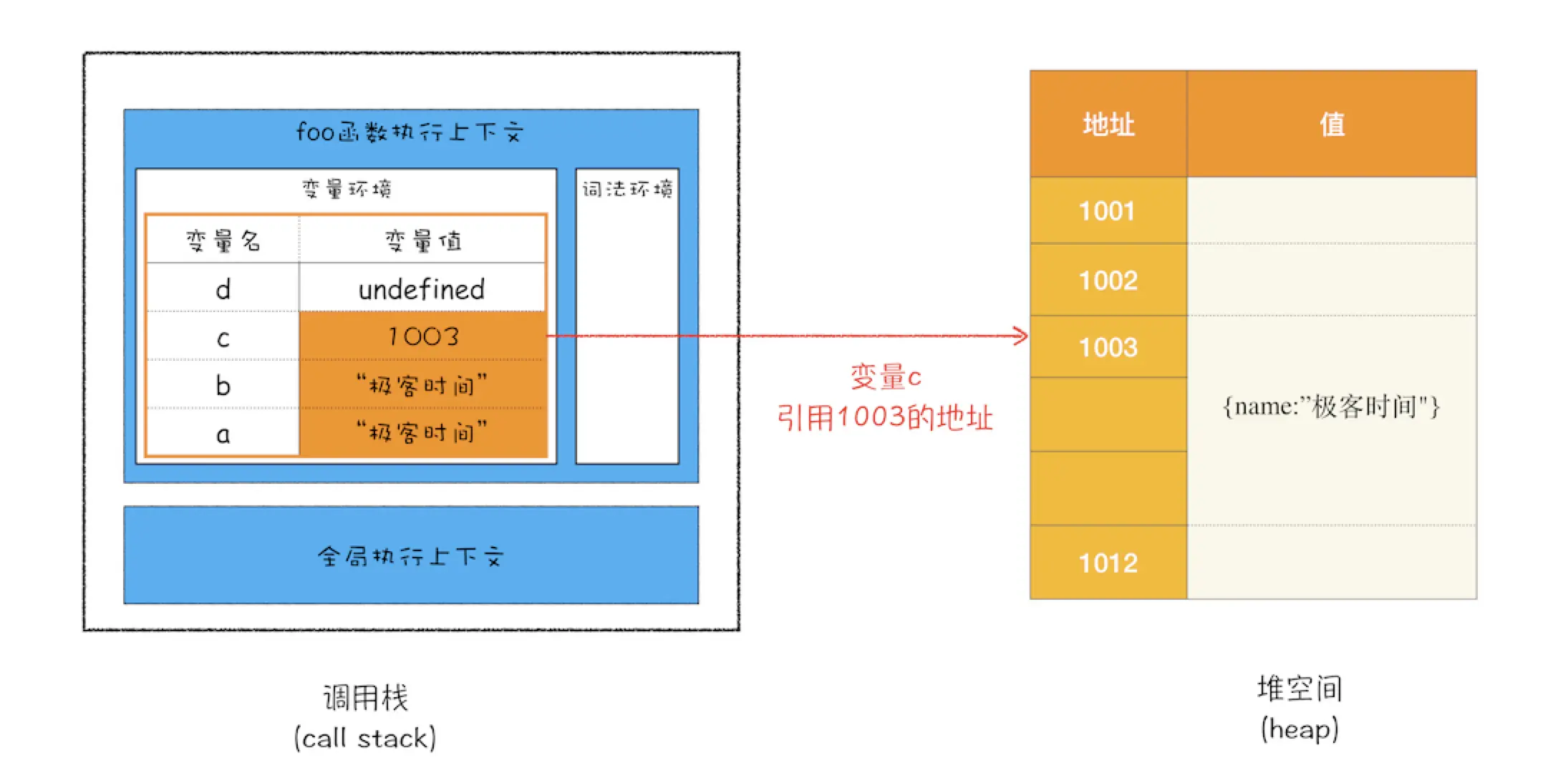 当执行c = {name:" 极客时间 "}时候,将对象存储在堆中然后把地址赋值给变量c