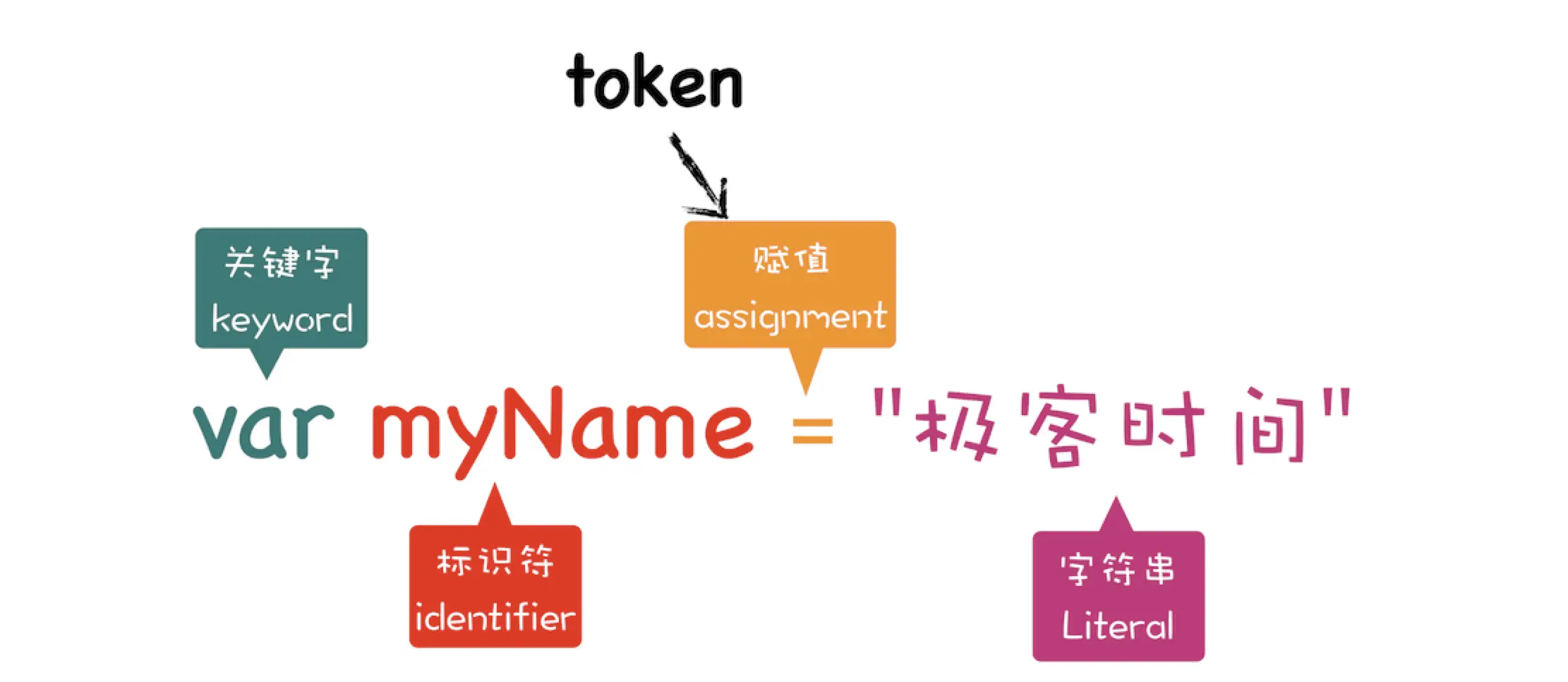 - 第一阶段是分词(tokenize),又称为词法分析,其作用是将一行行的源码拆解成一个个 token。所谓token,指的是语法上不可能再分的、最小的单个字符或字符串。你可以参考下图来更好地理解什么 token。