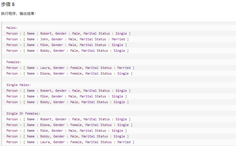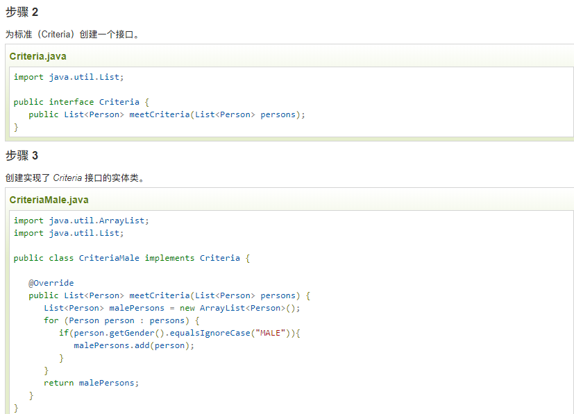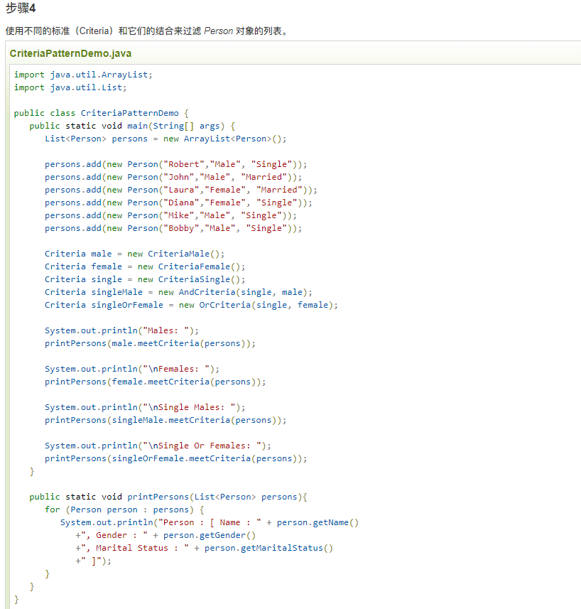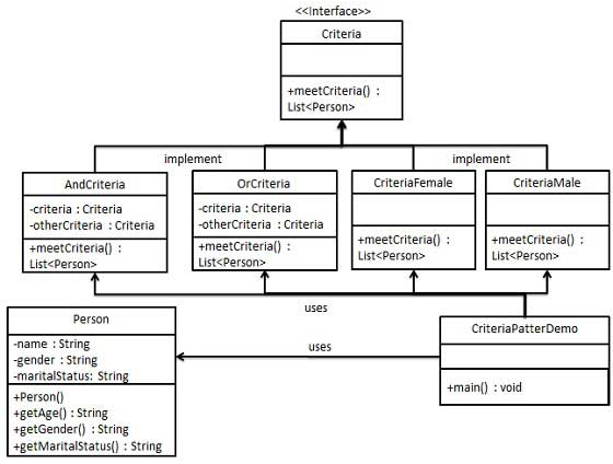 实现 我们将创建一个 Person 对象、Criteria 接口和实现了该接口的实体类,来过滤 Person 对象的列表。CriteriaPatternDemo,我们的演示类使用 Criteria 对象,基于各种标准和它们的结合来过滤 Person 对象的列表。