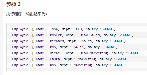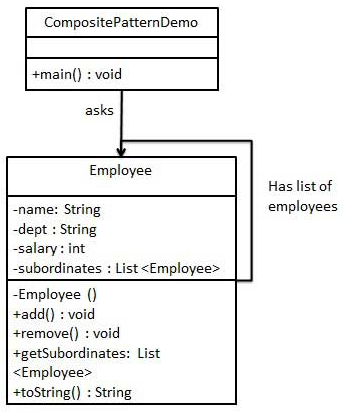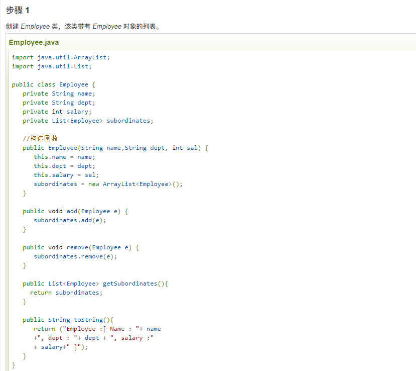 我们有一个类 Employee,该类被当作组合模型类。CompositePatternDemo,我们的演示类使用 Employee 类来添加部门层次结构,并打印所有员工。