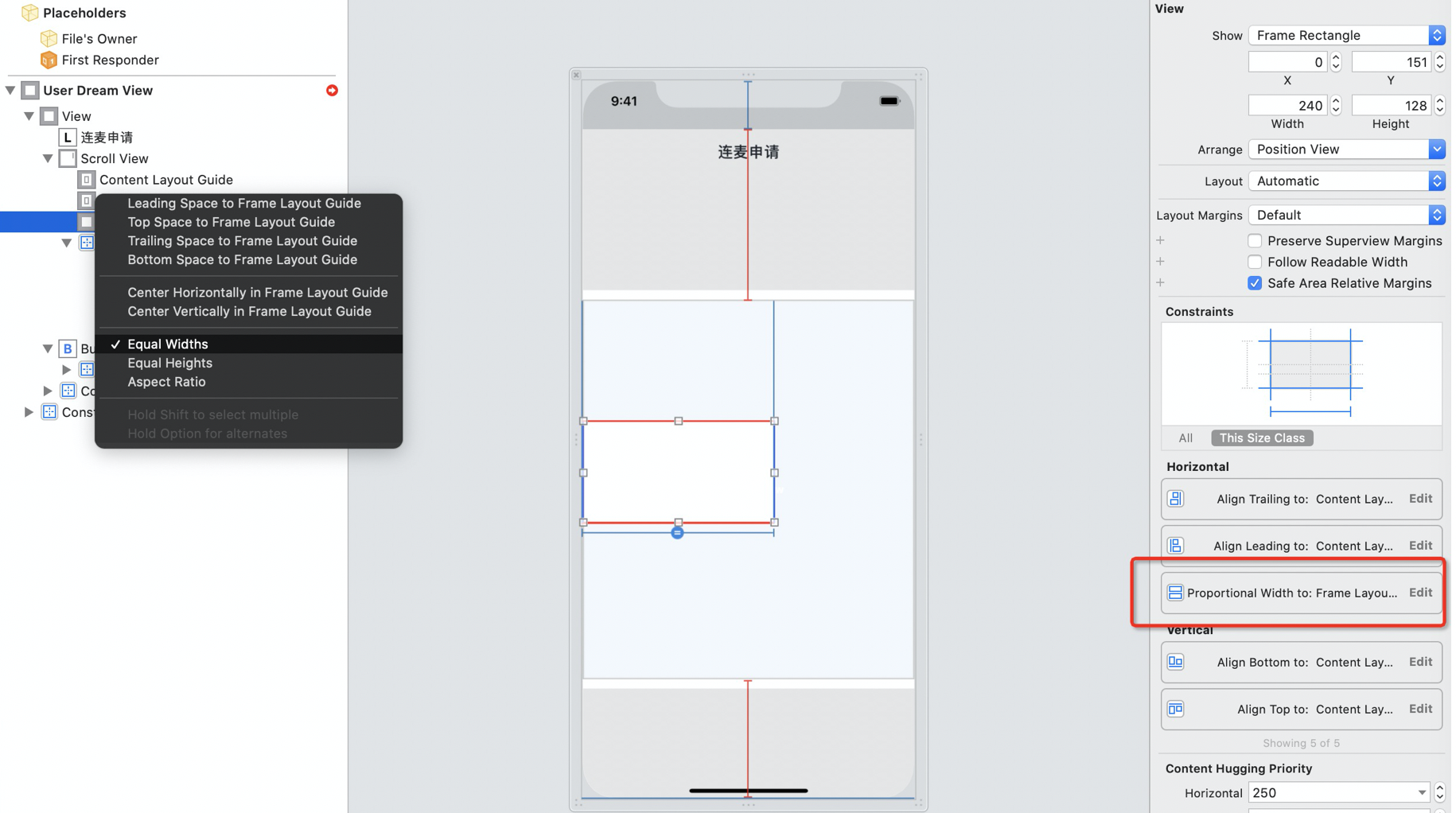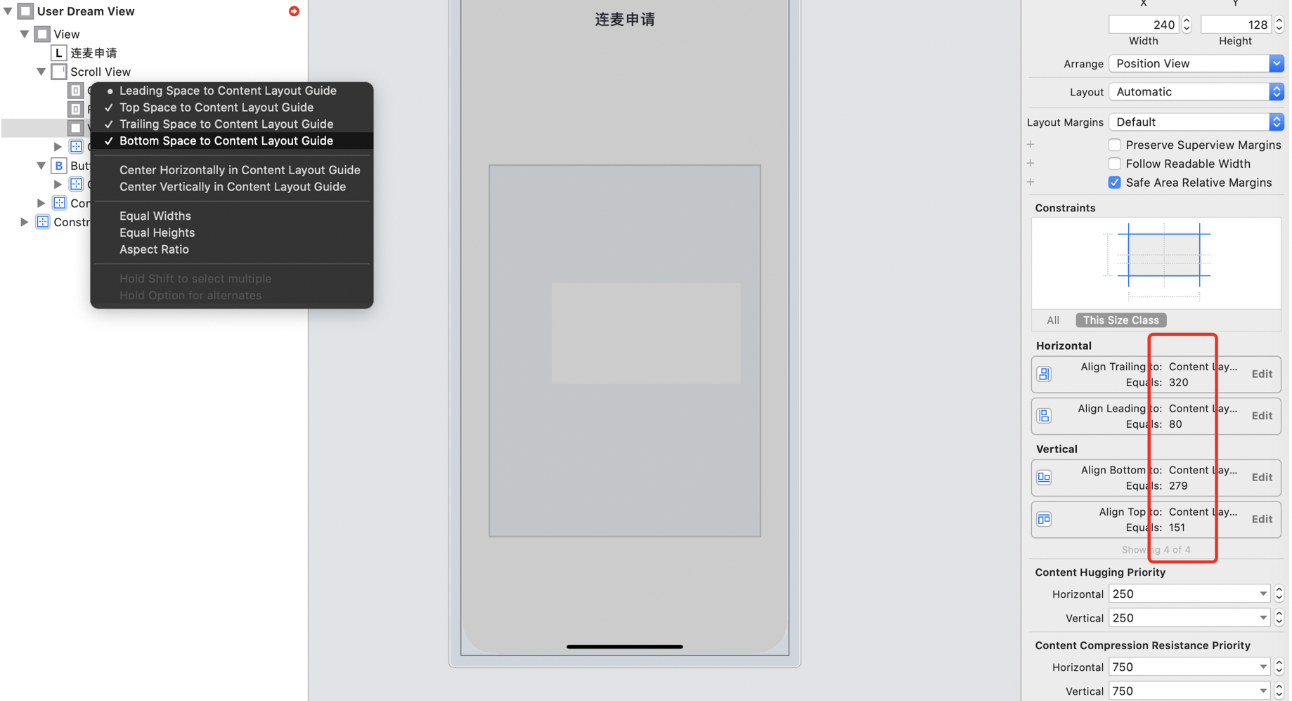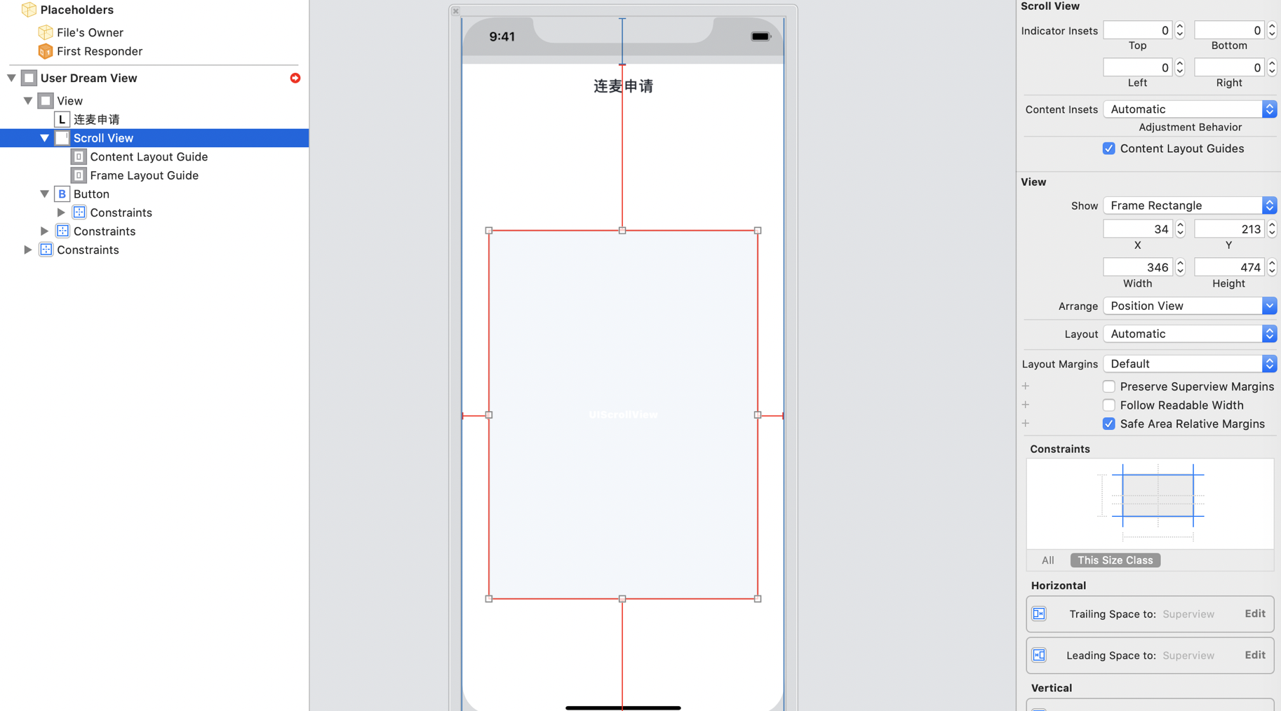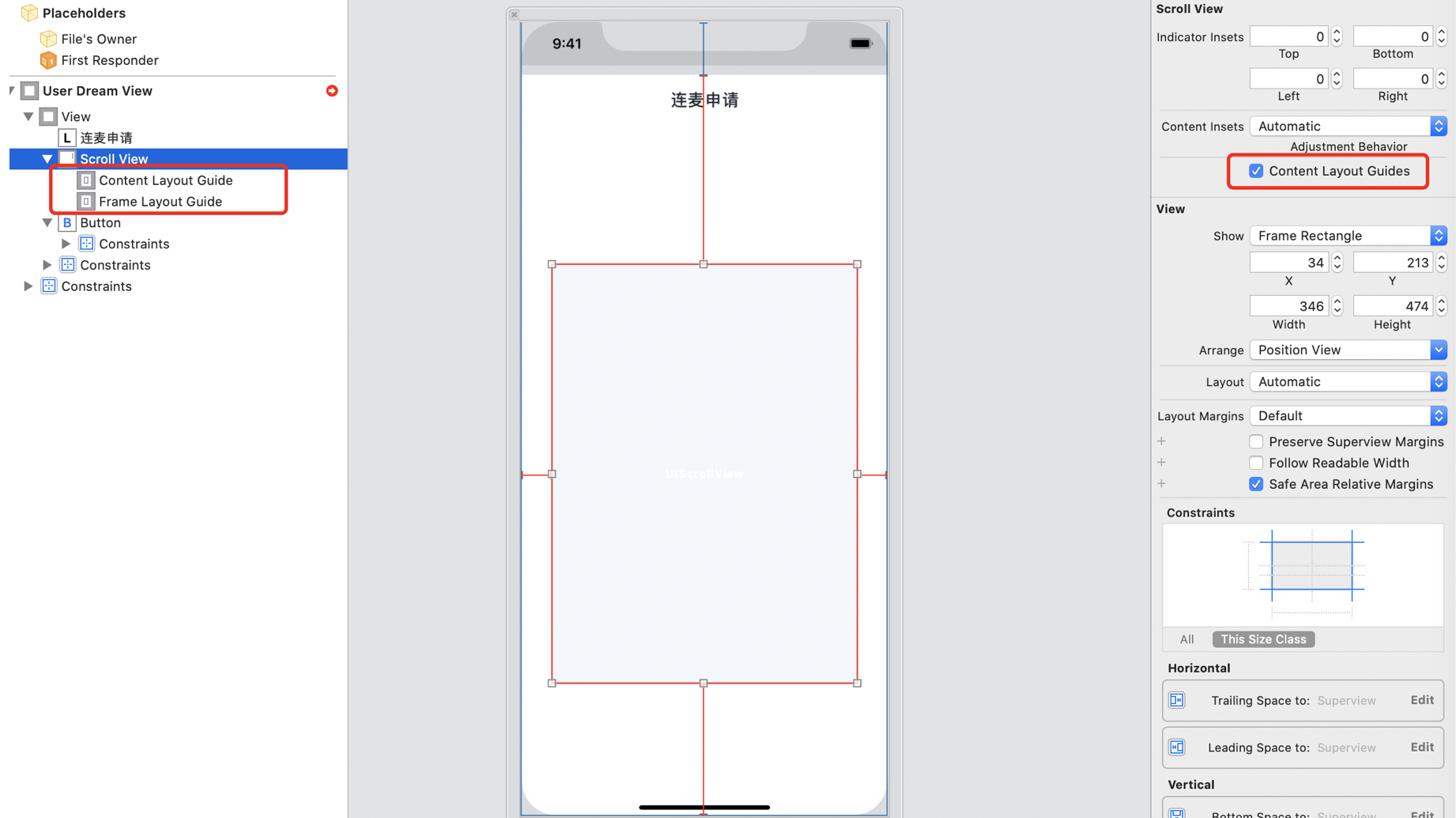 - 完成UIScrollView自身相对于父视图的布局设置,这个是Frame Layout Guide的部分