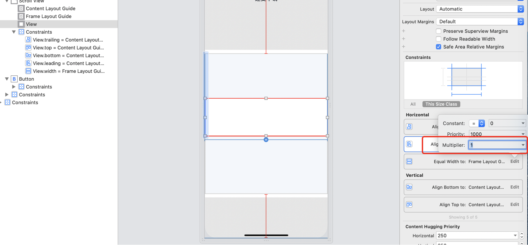 上面的步骤设置之后,我们会发现红线仍然存在,这是因为AutoLayout仍然不知道内容的滚动范围是多大,我们接下来设置滚动范围,具体步骤为:左键选中添加的 View,右键拖动到 Frame Layout Guide,如果选中之后,不是同等宽度,需要对添加的 同等宽度进行编辑,设置 Multiplier 为 1,最后为 添加的 View 设置 Height ,到这里 UIScrollerView 的 content 和 frame 就设置完成了,可以正常使用了。