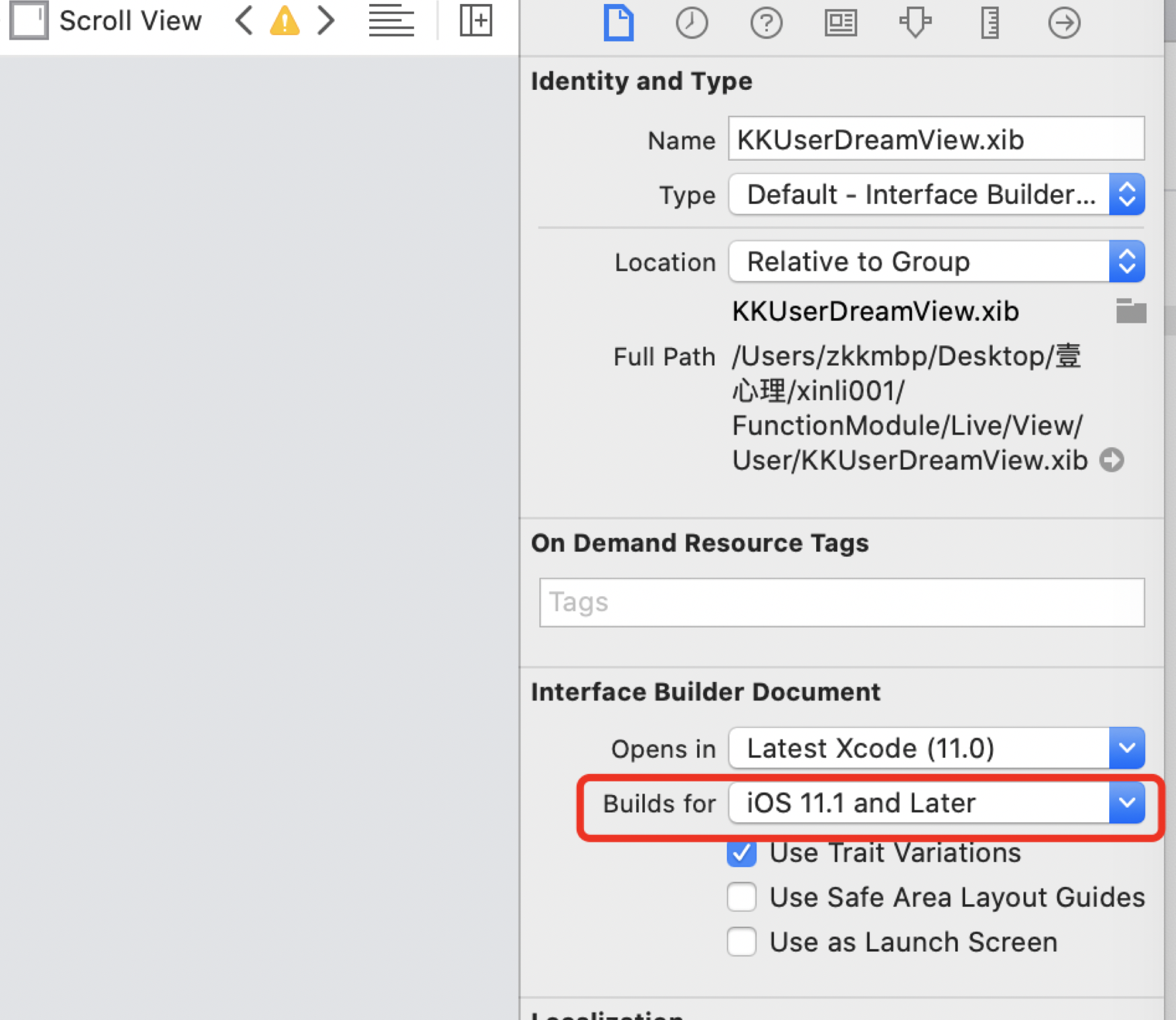 使用这种方式创建的 ScrollerView 如果在运行时报错,只需要找到对应的创建位置,修改版本号就可以了,但是这个操作之后,只能在 iOS 11 之后的设备上才可以使用。