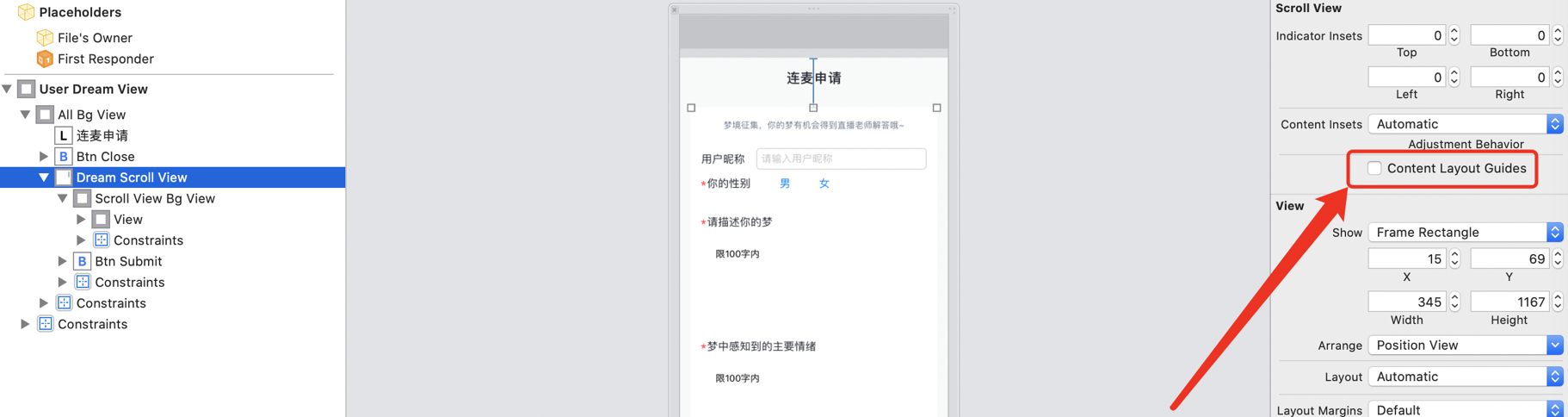 - 将右边检查器中Content Layout Guides的勾勾去掉,这样Content Layout guide和Frame Layout Guide在UIScrollView中就会自动消失,这时候布局就跟以前的Xcode版本一样
