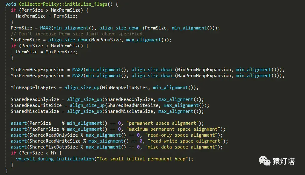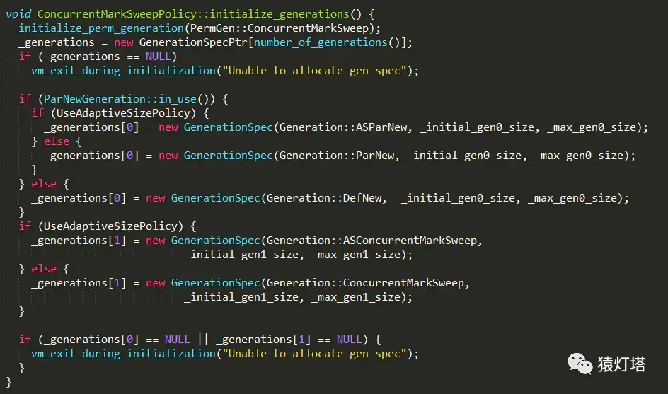 GenerationSpec实例中的数据,如果设置UseSharedSpaces和DumpSharedSpaces,还需要保存额外的数据。ConcurrentMarkSweepPolicy::initialize_generations方法实现了分代生成器的初始化,实现如下:初始化Java堆管理器