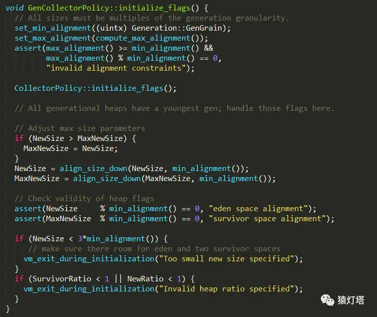 OldSize,则使用min_heap_byte_size() - min_gen0_size(),即最小堆大小和新生代最小值之差设置老年代最小值,初始值类似;OldSize,通过adjust_gen0_sizes方法重新设置新生代的最小值和初始值;初始化分代生成器