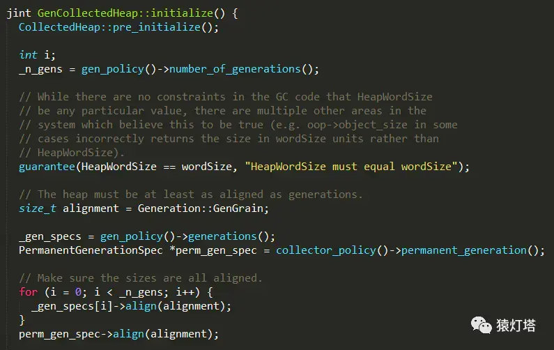 GenCollectedHeap是整个Java堆的管理器,负责Java对象的内存分配和垃圾对象的回收,通过initialize方法进行初始化,实现如下: