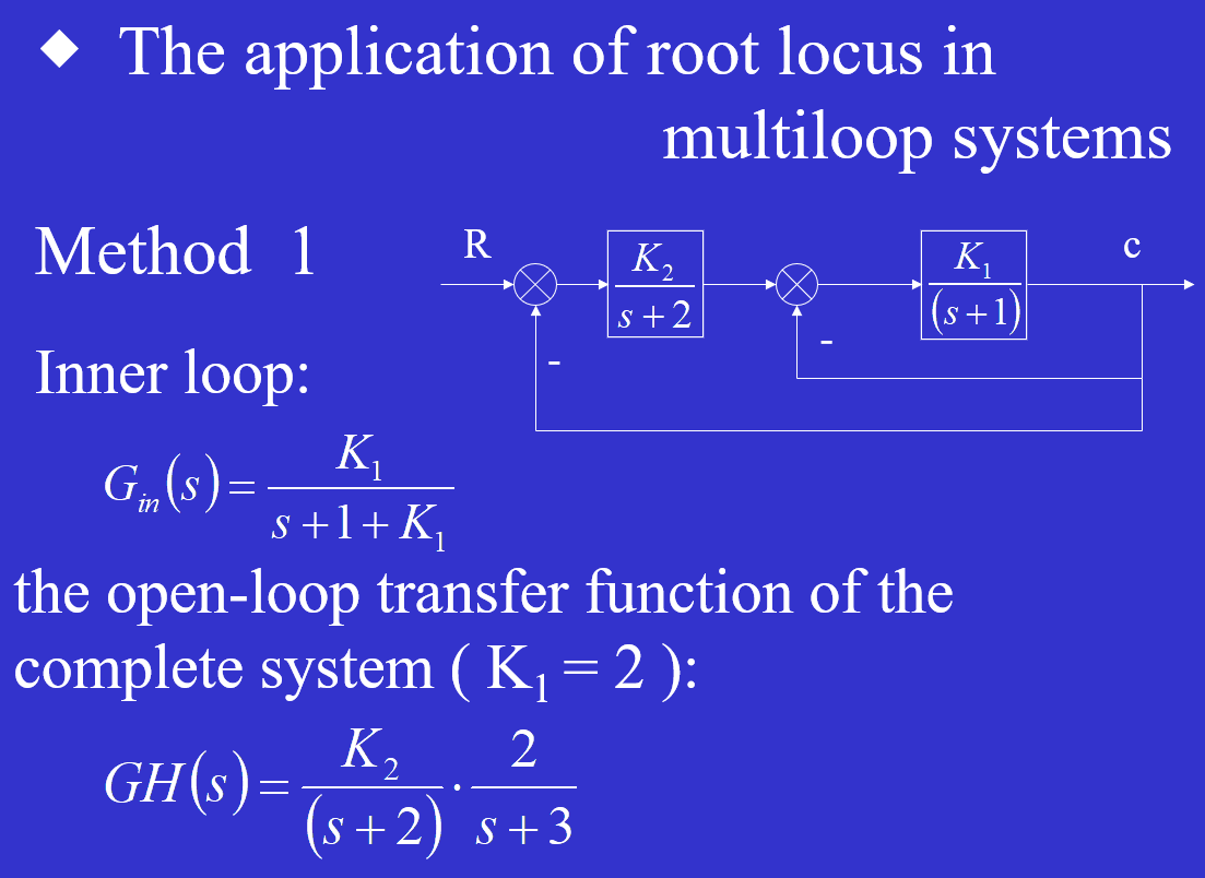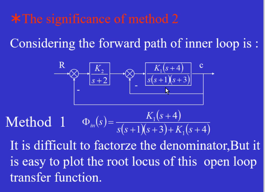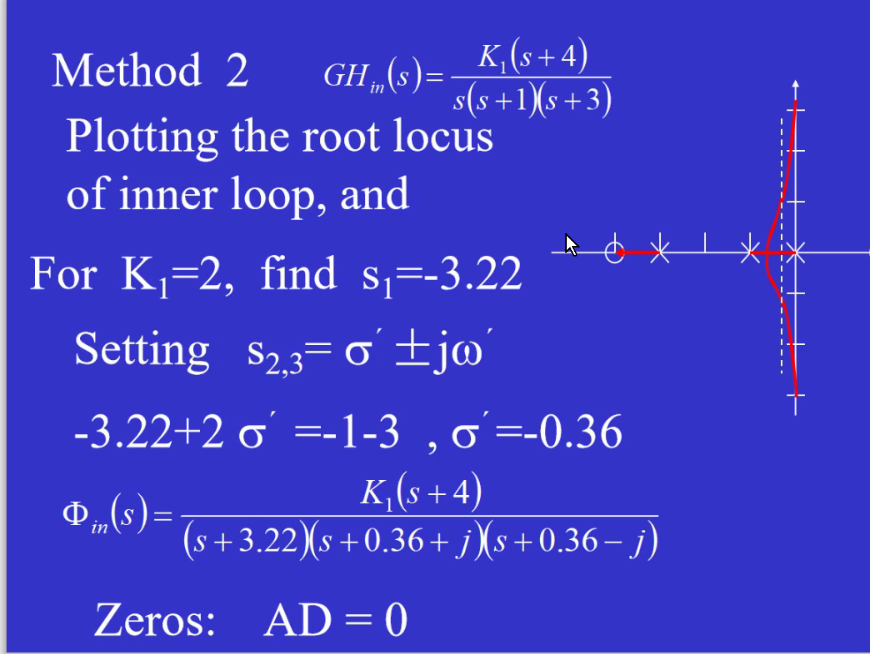 《自控原理》 Module11 根轨迹系统分析 赤西沽 2020-05-22 253 阅读1分钟 利用根轨迹闭合内环 运用Rule9 法二的重要性:内环的开环传函及其复杂的时候用法二更快! 给定K1=2;对应n=3个闭环极点;先找最简单的那个,(-4,-3)里的,设s,列方程即可解出s1=-3.22;另外两个闭环极点分两种情况,如下①相遇前,②相遇后,但是由于第一个极点解出只有一个根,所以①排除,是②,是一对共轭极点。 ②rule10:-3.22+2σ=-1-3 -> σ=-0.36;画σ=-0.36与根轨迹的交点即为两个共轭复数根(不精确)