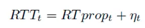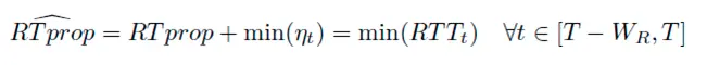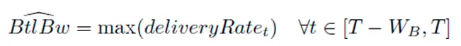 η 是其它因素导致的 noise 延迟,包括接收端延迟 ack 等原因导致的延迟。因为 RTprop 是链路上的固有延迟,可以认为只有链路上选择的路径变化时候它才会变化,并认为它变化频率很低,变化间隔时间远大于 η。η 一定是正数,RTT 无论如何不可能低于 RTprop,所以可以在一个时间窗口 Wr 内(一般是在几十秒到几分钟之间)监控最小的 RTT 的最小值,认为就是近似为 RTprop。