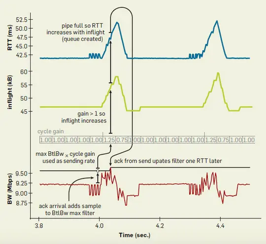 后来知道,ProbeBW 期间一个周期大致上是一个 RTT 时间,但发送速度 1.25 的周期和发送速度 0.75 的周期并不是严格等长的。1.25 周期时长是 inflights 数量到达 1.25 倍估计的 BDP 或有数据丢包。0.75 周期长度是一个完整的估计的 RTprop,或者 inflights 低于估计的 BDP。发送者能感知到 inflights 低于 BDP 的时候实际 inflights 一定低很多了,所以 BBR 的 inflights 曲线都是像心跳一样,上面一个三角下面一个三角,而不是只有上面的三角。在 19 ~ 20s 的时候,上三角比下三角大。20 ~ 21s 因为带宽变大了,但发送带宽只是缓慢增加上去,所以下三角比上三角大很多,等到稳态以后又变成上三角大于下三角。42s 以后因为每个减周期都要等到 Inflights 低于估计的 BDP,所以绿线一路向下。