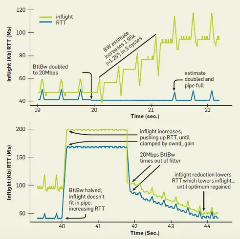 下半部分是带宽从 20Mbps 降低到 10Mbps,BBR 内因为维护了 BtlBW max filter 即从一个窗口期内采样得到的 BtlBw 值中取最大值作为当前链路的 BtlBw。所以即使带宽出现突降,因为 20Mbps 的 BtlBw 还在 max filter 内缓存着,这段时间 BBR 依然认为 BtlBw 是 20Mbps,会按照原来的发送速度继续发数据。于是带宽突降后延迟和 inflight 数据量大幅度增加。 但 inflights 数据量最大不能超过 BBR 内的 target_cwnd,其值等于 cwnd_gain * 估计的 BDP,BBR 会始终控制发送速率保持 inflights 在 target_cwnd 内,cwnd_gain 比 1 大,但不会大很多,所以带宽突然变小后 inflights 不会无限增加,并且会维持一个固定值,在图中表现为 40s ~ 42s 之间的一条水平线。这个期间即使处在 ProbeBW 阶段也无法执行增周期按 1.25 倍速率发数据,因为 target_cwnd 是满的,必须遵从它的限制,它限制了发送端不能让 inflights 数据量比它大。Inflights 和 RTT 能是一条水平线说明链路上 Buffer 比较大,能承载 target_cwnd 下的数据量且不出现丢包。