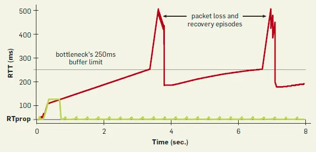 下面是 BBR 和 Cubic 在延迟时间上的对比。BBR 开始延迟大但随即恢复。CUBIC 一直增长下去直到丢包,再减小再增长。
