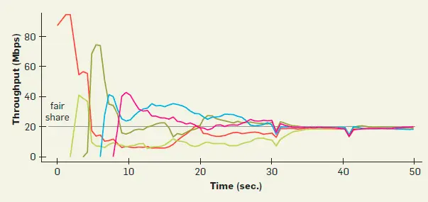 当多个 BBR 流在同一个链路时如下图。基本上就是靠 BtlBw max filter 内 BtlBw 超时过期以及 ProbeRTT 逐步让每个 BBR 流都找到自己合适的份额。在一开始只有红色的线,之后绿的来了,红色线继续按原来速度发数据链路一定会拥塞,并且因为有两个流了红线的 deliveryRate 一定会下降,BtlBw 超时后红线降低发送速率。大致上就是这么相互作用,每来一个流需要调整一下直到稳定。
