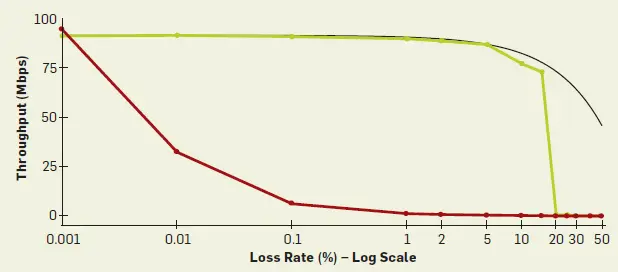 下面是 CUBIC (红色)和 BRR (绿色)在面对丢包的时候吞吐量表现。CUBIC 在丢包 1% 的时候基本就无法工作了,BRR 能扛到 20% 的丢包率。黑线是理想状况下的吞吐量,因为有丢包存在,所以吞吐量随着丢包率升高而递减。