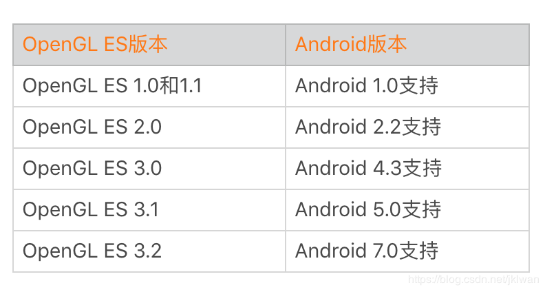 OpenGL是用于渲染2D、3D矢量图形的跨语言、跨平台的应用程序编程接口(API),而在嵌入式和移动平台的版本是OpenGL ES。Android最初就支持OpenGL ES的1.0版本,到现在已经支持到最新的3.2版本,下面的支持变化图