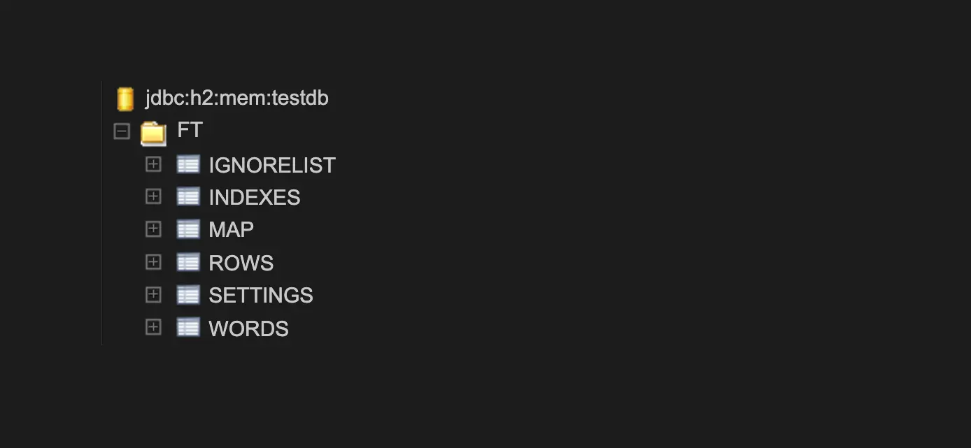 使用 FT_INIT() 来进行全文检索的初始化,初始化过程指定使用 H2 内置的全文检索功能。
