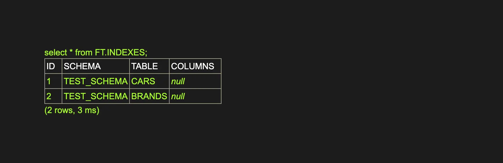 执行完语句之后会创建名字为 FT 的 Schema,在 FT 中会创建几个新的表,其中 INDEXS 中存储的是建立索引的规则。