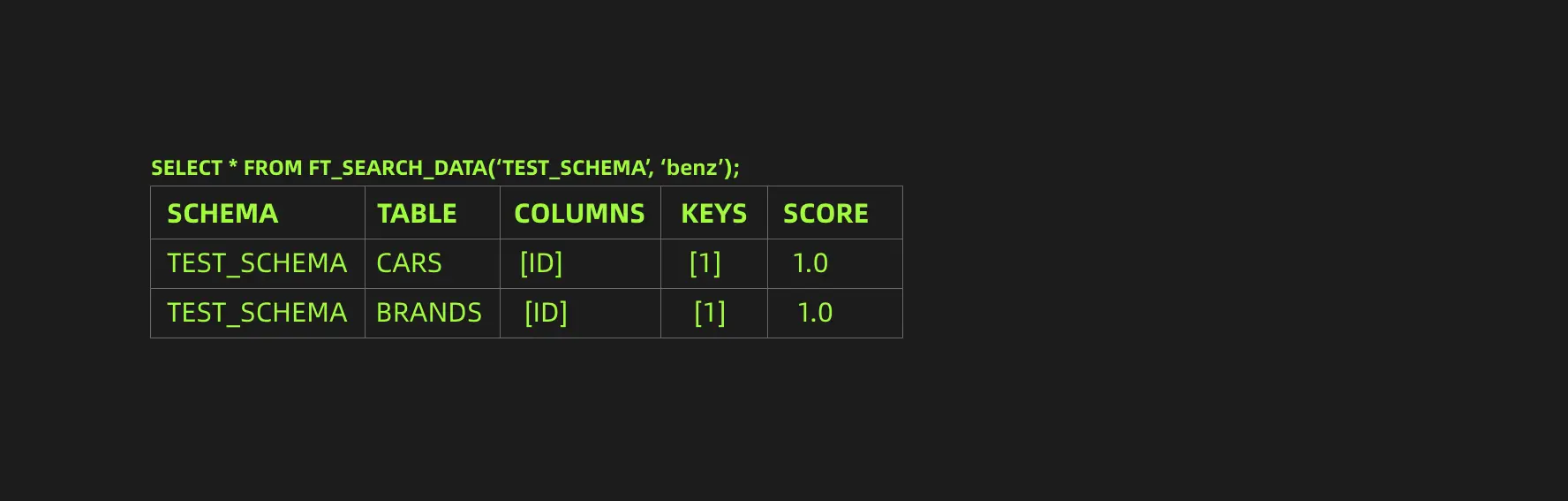 SELECT * FROM FT_SEARCH_DATA('benz', 0, 0);