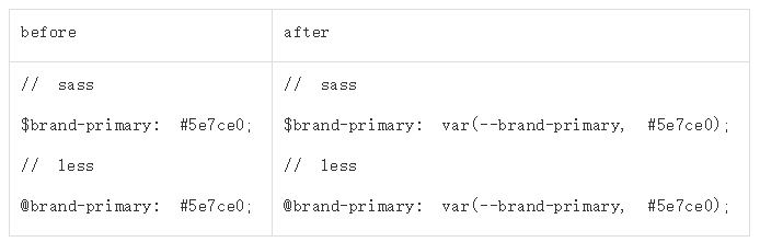 这里有个副作用就是,一旦色值被定义为var变量,则这个var表达式就无法再被less/sass的色彩计算函数所计算使用,这块我们在后面的章节再进行讨论。