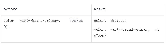 });该postcss插件通过遍历css规则里的带有var(--变量名, 变量值)在该行的上一行插入了一行替换为直接变量值的值,兼容不支持css var的浏览器。